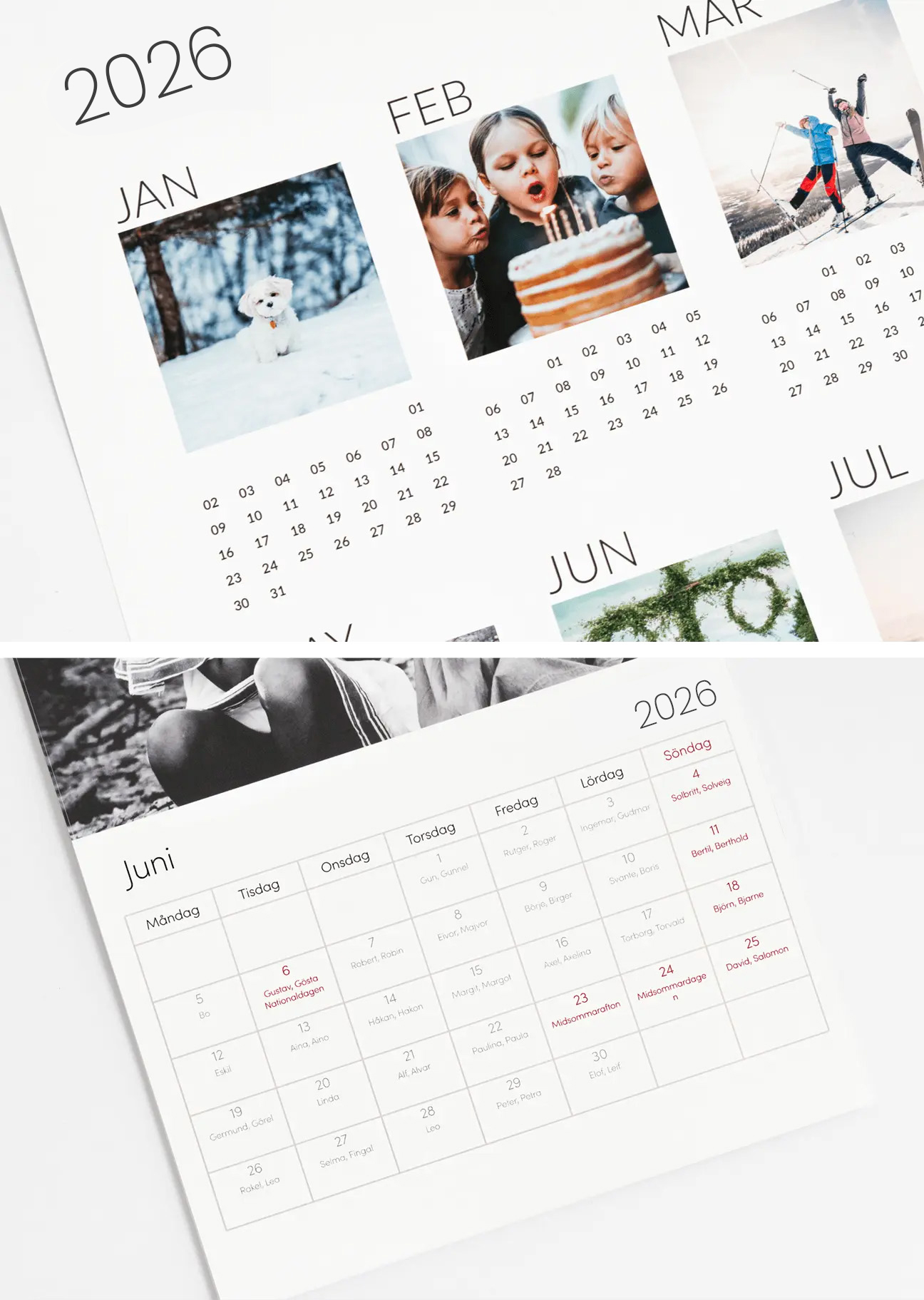 Klassisk fotokalender 2026 med svenska namnsdagar och helgdagar. Alla kalendrar tillverkas i Sverige och du kan enkelt skapa din egen genom att lägga till personliga bilder och texter. Designa direkt på mobil, surfplatta eller dator – snabbt och smidigt. Våra fotokalendrar trycks med samma prisbelönta teknik som våra fotoböcker, vilket ger hög kvalitet på varje sida.