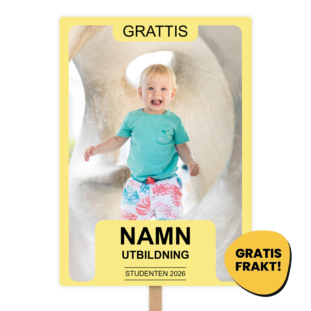 Ett studentplakat som är både kul och enkelt att fixa ♥ Beställ ditt plakat direkt från mobilen eller datorn – smidigt och snabbt. Det enda du behöver göra är att välja en fin bild, ladda upp den i den mall du gillar bäst och komplettera med den text du vill ha med. Vanligtvis skriver man in studentens namn och utbildningsprogram, men det bestämmer du själv. Plakaten trycks i standardstorleken 50 x 70 cm och levereras tillsammans med pinne. Pinnen fästs enkelt på baksidan med den dubbelhäftande tejp som medföljer. Våra plakat har dessutom rundade hörn – en extra trygghet när det är mycket folk i rörelse! Billiga studentplakat – precis som det ska vara För oss är det självklart att ett studentplakat inte ska kosta för mycket. Bläddra bland våra produkter, välj den design som passar dig bäst och få både bra pris och snabb frakt. Studentplakat: Skapa en oförglömlig skylt till din studentdag Därför betyder studentplakat så mycket Studenten är en unik tid i livet – ett avslut på en resa och starten på nästa. Studentplakatet har blivit en stark tradition som lyfter känslan av stolthet och glädje. Med personliga bilder och kärleksfulla hälsningar blir det ett minne för livet, lika självklart som studentmössan. Därför ska du välja oss Hos oss får du en enkel och personlig upplevelse när du skapar ditt studentplakat. Vi vet hur viktig den här dagen är och ser alltid till att leverera hög kvalitet som motsvarar dina förväntningar.
