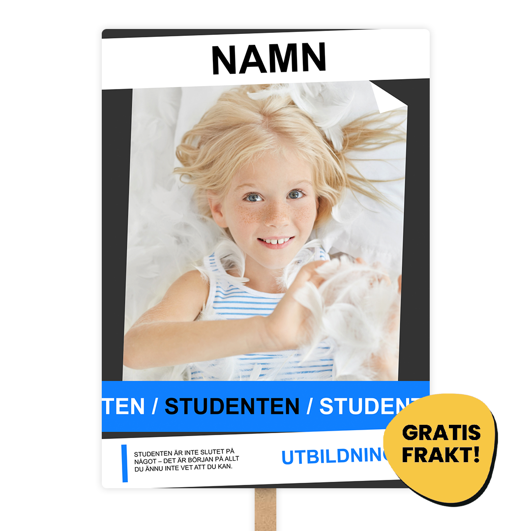 Ett studentplakat som är både kul och enkelt att fixa ♥ Beställ ditt plakat direkt från mobilen eller datorn – smidigt och snabbt. Det enda du behöver göra är att välja en fin bild, ladda upp den i den mall du gillar bäst och komplettera med den text du vill ha med. Vanligtvis skriver man in studentens namn och utbildningsprogram, men det bestämmer du själv. Plakaten trycks i standardstorleken 50 x 70 cm och levereras tillsammans med pinne. Pinnen fästs enkelt på baksidan med den dubbelhäftande tejp som medföljer. Våra plakat har dessutom rundade hörn – en extra trygghet när det är mycket folk i rörelse! Billiga studentplakat – precis som det ska vara För oss är det självklart att ett studentplakat inte ska kosta för mycket. Bläddra bland våra produkter, välj den design som passar dig bäst och få både bra pris och snabb frakt. Studentplakat: Skapa en oförglömlig skylt till din studentdag Därför betyder studentplakat så mycket Studenten är en unik tid i livet – ett avslut på en resa och starten på nästa. Studentplakatet har blivit en stark tradition som lyfter känslan av stolthet och glädje. Med personliga bilder och kärleksfulla hälsningar blir det ett minne för livet, lika självklart som studentmössan. Därför ska du välja oss Hos oss får du en enkel och personlig upplevelse när du skapar ditt studentplakat. Vi vet hur viktig den här dagen är och ser alltid till att leverera hög kvalitet som motsvarar dina förväntningar.